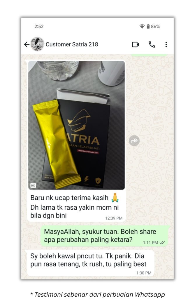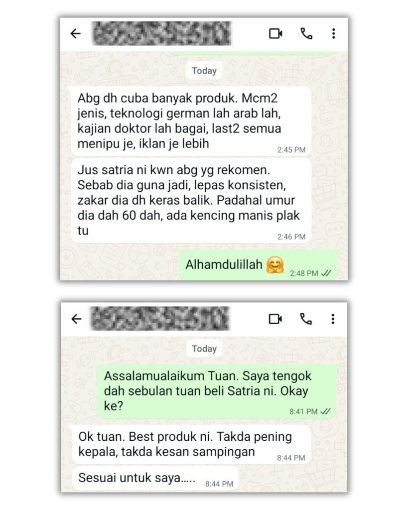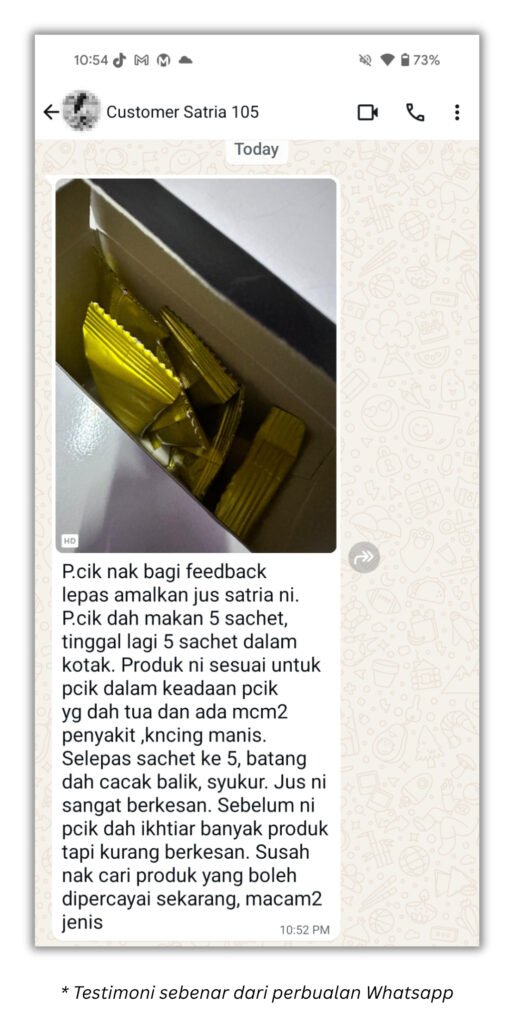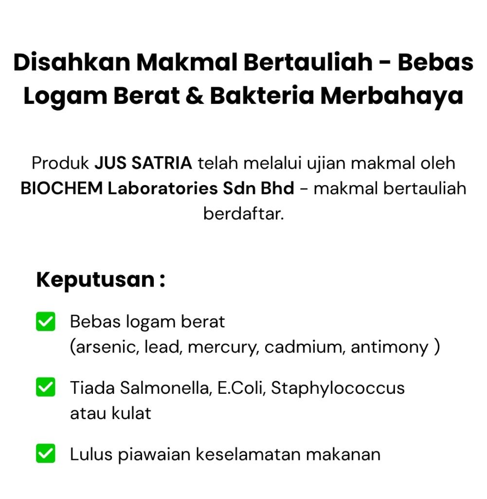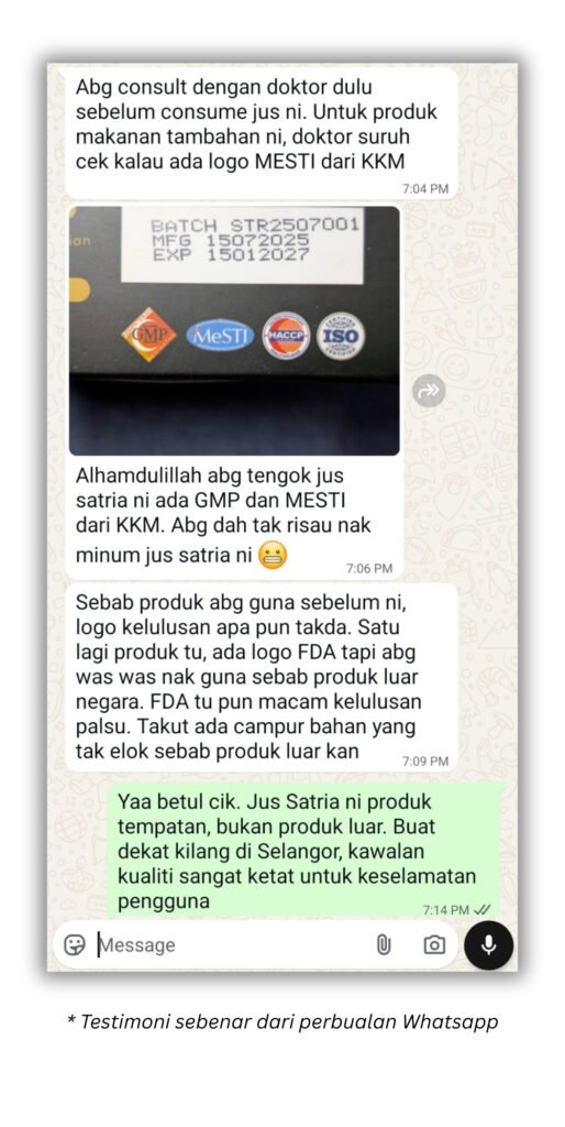 Ya, Jus Satria dihasilkan di kilang berstatus GMP yang disahkan oleh Kementerian Kesihatan Malaysia (KKM). Setiap kotak melalui proses kawalan kualiti ketat untuk memastikan ia selamat digunakan.