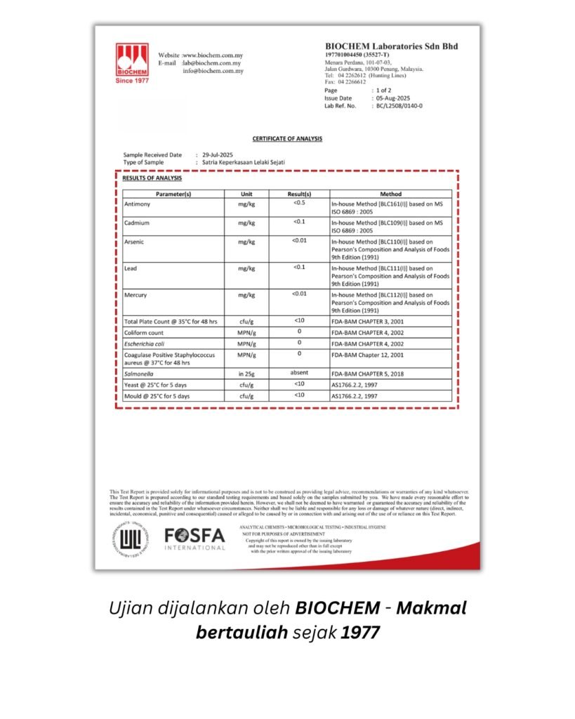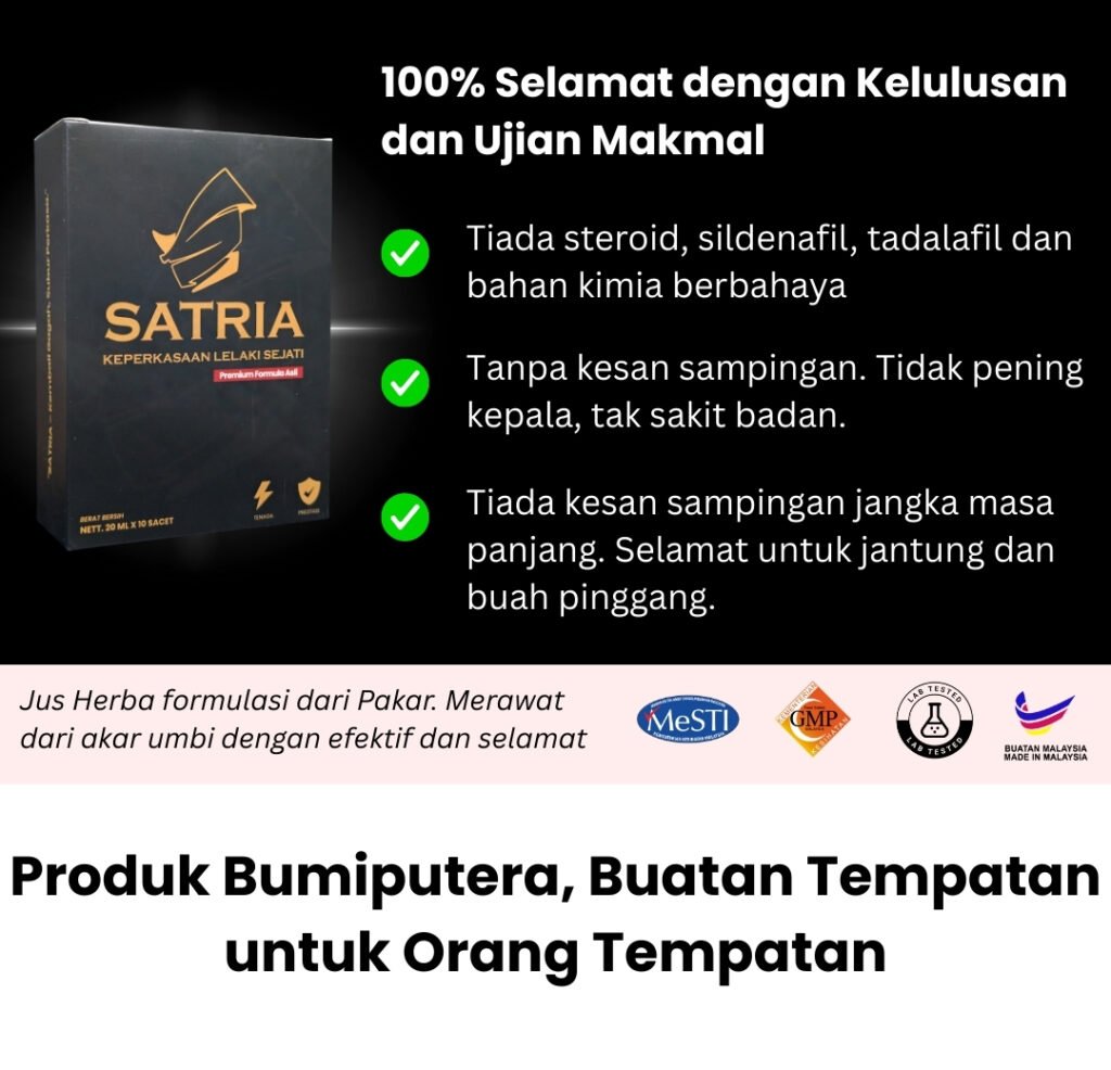 Ya, Jus Satria 100% daripada herba semula jadi dan tiada campuran bahan terlarang seperti sildenafil dan tadalafil. Telah diuji oleh makmal BIOCHEM(Penang) & disahkan bebas bahan merbahaya. Produk ini dihasilkan di kilang bertaraf GMP dan setiap batch diperiksa kualitinya untuk keselamatan pengguna.
